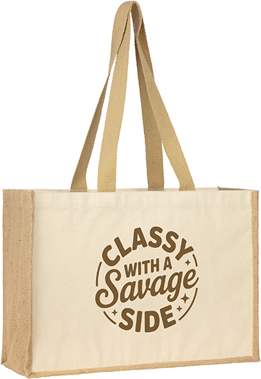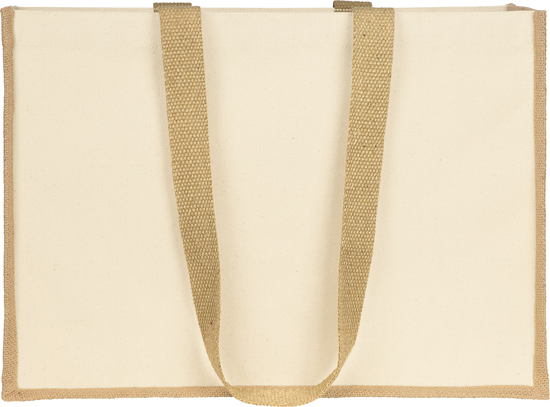 Description: Stylish Eco, all natural natural Tote Shopper with 10oz (340gsm) canvas body & 14/15 Jute (with PVA/Natural starch mix backing) bottom and sides. Long cotton webbing handles